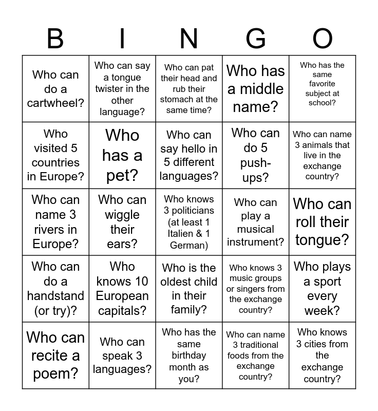 This bingo card has a free space and 24 words: Who knows 10 European capitals?, Who can speak 3 languages?, Who can say hello in 5 different languages?, Who can recite a poem?, Who has the same favorite subject at school?, Who can do a cartwheel?, Who visited 5 countries in Europe?, Who can say a tongue twister in the other language?, Who can play a musical instrument?, Who is the oldest child in their family?, Who can do 5 push-ups?, Who can name 3 rivers in Europe?, Who knows 3 music groups or singers from the exchange country?, Who plays a sport every week?, Who has a pet?, Who can name 3 traditional foods from the exchange country?, Who can roll their tongue?, Who can pat their head and rub their stomach at the same time?, Who can name 3 animals that live in the exchange country?, Who can wiggle their ears?, Who knows 3 cities from the exchange country?, Who can do a handstand (or try)?, Who has a middle name? and Who has the same birthday month as you?.