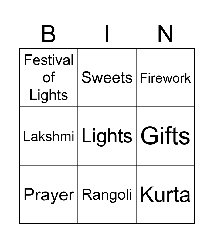 This bingo card has 18 words: Diya, Candle, Firework, Festival of Lights, Diwali, Lakshmi, Mithai, Sweets, Rangoli, Kurta, Saree, Lights, Ram, Gifts, Prayer, Cards, Lantern and New Year.