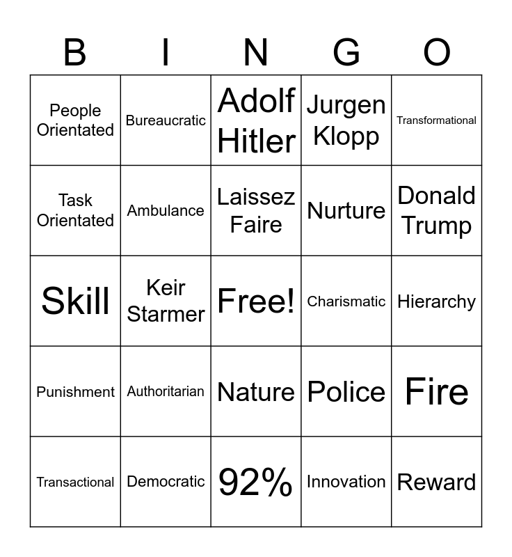 This bingo card has a free space and 24 words: Authoritarian, Democratic, Laissez Faire, Transactional, Transformational, People Orientated, Task Orientated, Bureaucratic, Charismatic, Nature, Nurture, Skill, Police, Fire, Ambulance, Innovation, Hierarchy, Adolf Hitler, Donald Trump, Keir Starmer, Reward, Punishment, Jurgen Klopp and 92%.
