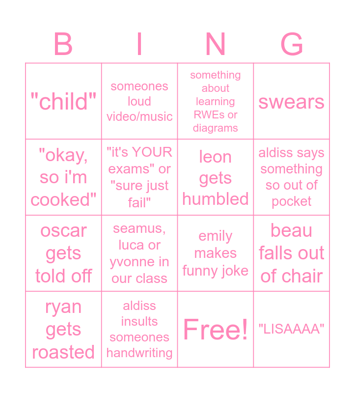 This bingo card has 17 words: Free!, ryan gets roasted, something about learning RWEs or diagrams, "child", seamus, luca or yvonne in our class, swears, beau falls out of chair, leon gets humbled, aldiss says something so out of pocket, "it's YOUR exams" or "sure just fail", aldiss insults someones handwriting, emily makes funny joke, "okay, so i'm cooked", someones loud video/music, oscar gets told off, "shut up" and "LISAAAA".