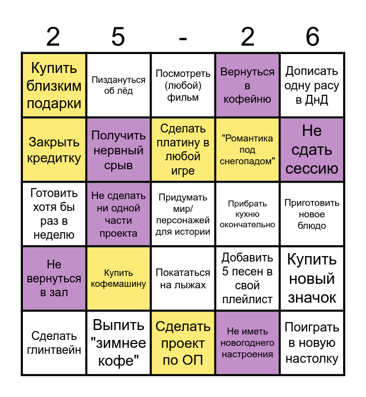 This bingo card has 25 words: Купить кофемашину, Сделать проект по ОП, Сделать платину в любой игре, Сделать глинтвейн, Дописать одну расу в ДнД, Купить близким подарки, Закрыть кредитку, Пиздануться об лëд, Прибрать кухню окончательно, Покататься на лыжах, "Романтика под снегопадом", Готовить хотя бы раз в неделю, Добавить 5 песен в свой плейлист, Купить новый значок, Получить нервный срыв, Поиграть в новую настолку, Приготовить новое блюдо, Посмотреть (любой) фильм, Не сдать сессию, Не сделать ни одной части проекта, Придумать мир/персонажей для истории, Выпить "зимнее кофе", Не вернуться в зал, Вернуться в кофейню and Не иметь новогоднего настроения.