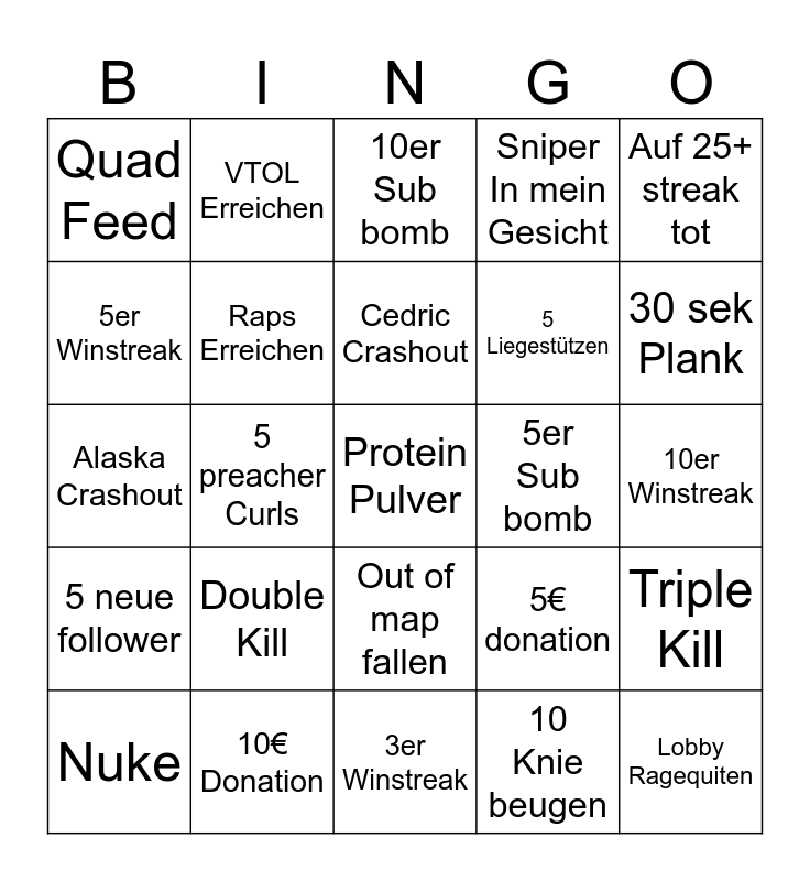 This bingo card has 25 words: Double Kill, 3er Winstreak, Cedric Crashout, Nuke, Auf 25+ streak tot, Quad Feed, 5er Winstreak, VTOL Erreichen, 5er Sub bomb, Out of map fallen, 5 Liegestützen, Alaska Crashout, 5€ donation, Triple Kill, Raps Erreichen, Lobby Ragequiten, 10er Winstreak, 10er Sub bomb, 30 sek Plank, 5 preacher Curls, Protein Pulver, 10€ Donation, 5 neue follower, Sniper In mein Gesicht and 10 Knie beugen.