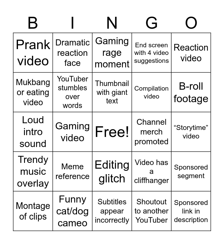 This bingo card has a free space and 64 words: Clickbait thumbnail, “Like and subscribe”, Video over 10 minutes, Sponsored segment, Random sound effect, Jump cut, Dramatic reaction face, “Turn on notifications”, Thumbnail with giant text, Weird background filter, Editing glitch, Talking directly to the camera, “Storytime” video, Reaction video, Unboxing video, Mukbang or eating video, Gaming video, Prank video, Challenge video, Compilation video, Meme reference, Trendy music overlay, End screen with 4 video suggestions, YouTuber says “guys” excessively, Overly dramatic title, Thumbnail shows “shocking moment”, YouTuber accidentally swears, Clickbait timestamp, Background music too loud, Text overlay animation, Product placement, Travel vlog segment, Time-lapse clip, Slow-motion shot, B-roll footage, Montage of clips, On-screen emoji, Shoutout to another YouTuber, “Giveaway” announcement, YouTuber stumbles over words, Loud intro sound, Channel merch promoted, Someone off-camera laughs, Dramatic zoom-in, Ending with “See you next time!”, Sponsored link in description, Funny cat/dog cameo, Outtakes or bloopers, Video has a cliffhanger, YouTuber dances randomly, Meme caption on screen, Face reveal (if previously hidden), Subtitles appear incorrectly, Yelling or loud reaction, Vlog in public, “POV” style video, Gaming rage moment, “I can’t believe this happened!”, Fake crying or exaggerated emotion, Trendy filter or effect, Thumbnail with a question mark, Text saying “You won’t believe this!”, Video starts with a random fact and YouTuber mispronounces a word.
