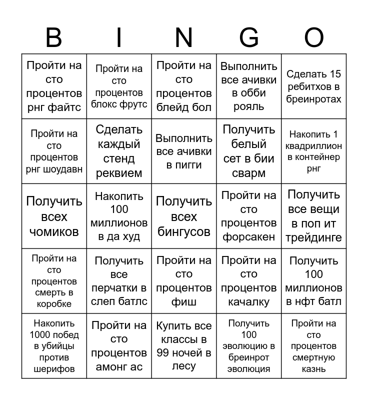 This bingo card has a free space and 24 words: Получить все перчатки в слеп батлс, Пройти на сто процентов амонг ас, Выполнить все ачивки в пигги, Накопить 1000 побед в убийцы против шерифов, Сделать 15 ребитхов в бреинротах, Пройти на сто процентов рнг файтс, Пройти на сто процентов рнг шоудавн, Пройти на сто процентов блокс фрутс, Пройти на сто процентов форсакен, Пройти на сто процентов фиш, Получить белый сет в бии сварм, Получить всех чомиков, Пройти на сто процентов качалку, Получить 100 миллионов в нфт батл, Сделать каждый стенд реквием, Получить 100 эволюцию в бреинрот эволюция, Получить все вещи в поп ит трейдинге, Пройти на сто процентов блейд бол, Накопить 1 квадриллион в контейнер рнг, Накопить 100 миллионов в да худ, Пройти на сто процентов смертную казнь, Пройти на сто процентов смерть в коробке, Выполнить все ачивки в обби рояль and Купить все классы в 99 ночей в лесу.