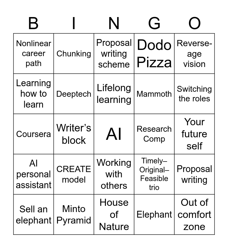 This bingo card has a free space and 24 words: CREATE model, Minto Pyramid, Lifelong learning, Sell an elephant, Reverse-age vision, Nonlinear career path, Learning how to learn, Chunking, Research Comp, Working with others, Mammoth, Coursera, Timely–Original–Feasible trio, Proposal writing, Deeptech, Elephant, Your future self, Proposal writing scheme, Switching the roles, Writer’s block, Out of comfort zone, AI personal assistant, Dodo Pizza and House of Nature.