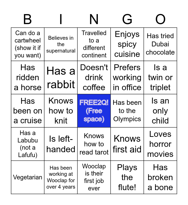 This bingo card has a free space and 29 words: Vegetarian, Knows calligraphy, Knows how to knit, Has skydived, Can do a cartwheel (show it if you want), Travelled to a different continent, Has a rabbit, Is left-handed, Has been to the Olympics, Has been working at Wooclap for over 4 years, Is an only child, Has broken a bone, Wooclap is their first job ever, Plays the flute!, Is a twin or triplet, Is a Capricorn, Knows how to read tarot, Has a Labubu (not a Lafufu), Has tried Dubai chocolate, Has been on a cruise, Knows first aid, Has never been on a plane, Prefers working in office, Has ridden a horse, Enjoys spicy cuisine, Believes in the supernatural, Loves horror movies, Doesn't drink coffee and Can ballroom dance.