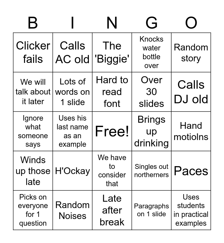 This bingo card has a free space and 24 words: H'Ockay, Random Noises, Hard to read font, Picks on everyone for 1 question, Random story, Clicker fails, We will talk about it later, Calls AC old, Brings up drinking, We have to consider that, Over 30 slides, Ignore what someone says, Singles out northerners, Paces, Lots of words on 1 slide, Paragraphs on 1 slide, Hand motiolns, The 'Biggie', Calls DJ old, Uses his last name as an example, Uses students in practical examples, Winds up those late, Knocks water bottle over and Late after break.