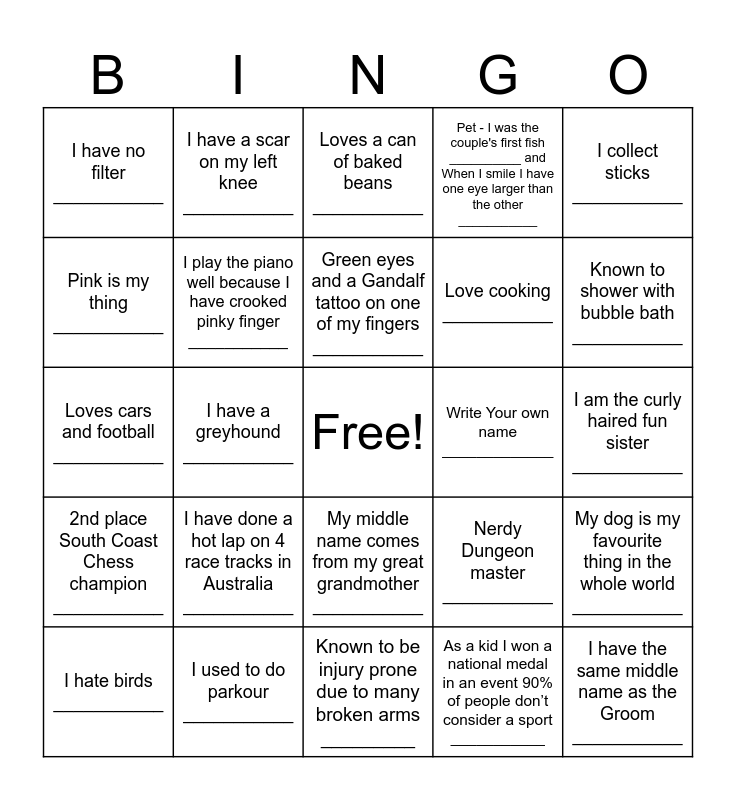This bingo card has a free space and 24 words: I have done a hot lap on 4 race tracks in Australia ___________, I used to do parkour ___________, Green eyes and a Gandalf tattoo on one of my fingers ___________, I hate birds ___________, I collect sticks ___________, I have no filter ___________, Pink is my thing ___________, I have a scar on my left knee ___________, Write Your own name _____________, My middle name comes from my great grandmother ___________, Love cooking ___________, Loves cars and football ___________, Nerdy Dungeon master ___________, My dog is my favourite thing in the whole world ___________, I play the piano well because I have crooked pinky finger ___________, As a kid I won a national medal in an event 90% of people don’t consider a sport ___________, I am the curly haired fun sister ___________, Loves a can of baked beans ___________, Known to shower with bubble bath ___________, I have a greyhound ___________, I have the same middle name as the Groom ___________, 2nd place South Coast Chess champion ___________, Pet - I was the couple's first fish __________ and When I smile I have one eye larger than the other ___________ and Known to be injury prone due to many broken arms _________.