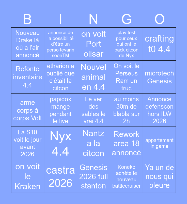 This bingo card has a free space and 24 words: Nyx 4.4, castra 2026, Nouvel animal en 4.4, on voit le Kraken, crafting t0 4.4, Nouveau Drake là où a l’air annoncé, Refonte inventaire 4.4, annonce de la possibilité d’être un perso tevarin soonTM, au moins 30m de blabla sur 2h, Nantz a la citcon, On voit le Perseus Ram un truc, arme corps à corps Volt, Rework area 18 annoncé, appartement in game, etharion a oublié que c’était la citcon, Koneko achète le nouveau battlecruiser, Annonce defenscon hors ILW 2026, on voit Port olisar, microtech Genesis, papidox mange pendant le live, Ya un de nous qui pleure, La S10 voit le jour avant 2026, play test pour ceux qui ont le pack citcon de Nyx and Genesis 2026 full stanton.