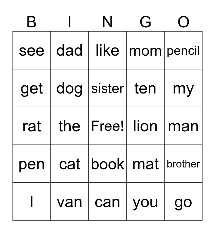 This bingo card has a free space and 29 words: I, is, the, we, see, like, dog, cat, lion, van, man, go, can, you, my, school, book, pen, pencil, rat, mat, sat, ten, get, mom, dad, brother, sister and son.
