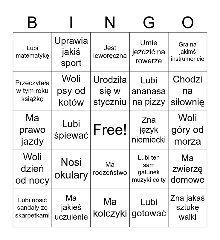 This bingo card has a free space and 24 words: Nosi okulary, Ma jakieś uczulenie, Urodziła się w styczniu, Lubi nosić sandały ze skarpetkami, Gra na jakimś instrumencie, Lubi matematykę, Przeczytała w tym roku książkę, Uprawia jakiś sport, Zna język niemiecki, Ma rodzeństwo, Lubi ananasa na pizzy, Ma prawo jazdy, Lubi ten sam gatunek muzyki co ty, Ma zwierzę domowe, Woli psy od kotów, Lubi gotować, Woli góry od morza, Jest leworęczna, Chodzi na siłownię, Lubi śpiewać, Zna jakąś sztukę walki, Woli dzień od nocy, Umie jeździć na rowerze and Ma kolczyki.