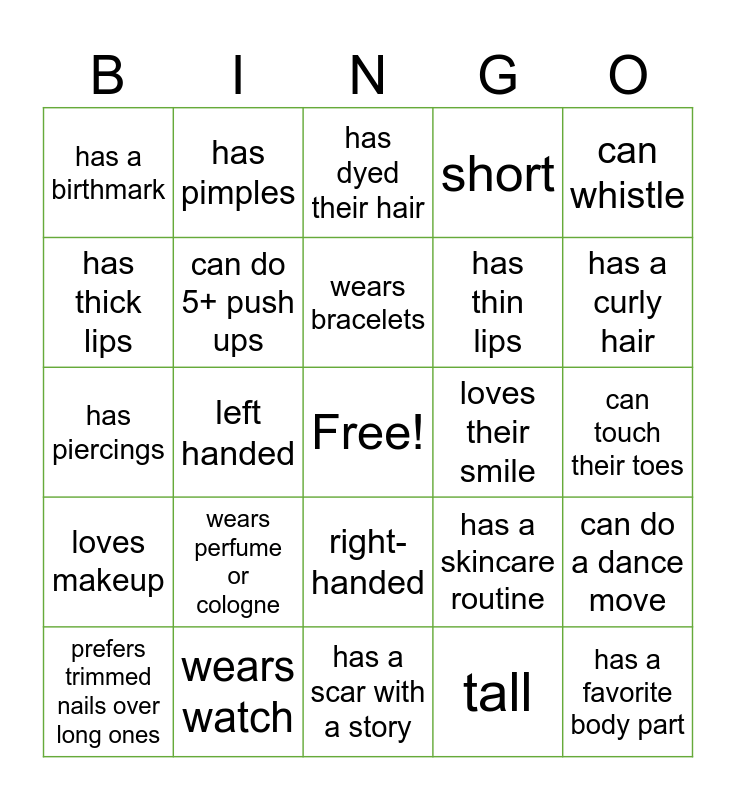 This bingo card has a free space and 31 words: has a scar with a story, wears glasses or contacts, left handed, plays a sport, has a birthmark, has dyed their hair, can do 5+ push ups, has a skincare routine, loves their smile, tall, can touch their toes, has a favorite body part, has tried a fitness app, can braid hair, has a curly hair, has/had braces, can do a dance move, wears perfume or cologne, loves makeup, right-handed, can whistle, likes to walk, prefers trimmed nails over long ones, has pimples, has thin lips, has thick lips, short, has piercings, wears watch, wears bracelets and wears rings.