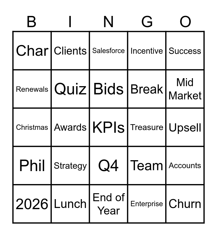 This bingo card has a free space and 24 words: Strategy, Lunch, Bids, 2026, Success, Char, Renewals, Clients, Treasure, Q4, Break, Christmas, Team, Accounts, Quiz, Enterprise, Upsell, Salesforce, Mid Market, Awards, Churn, Phil, Incentive and End of Year.