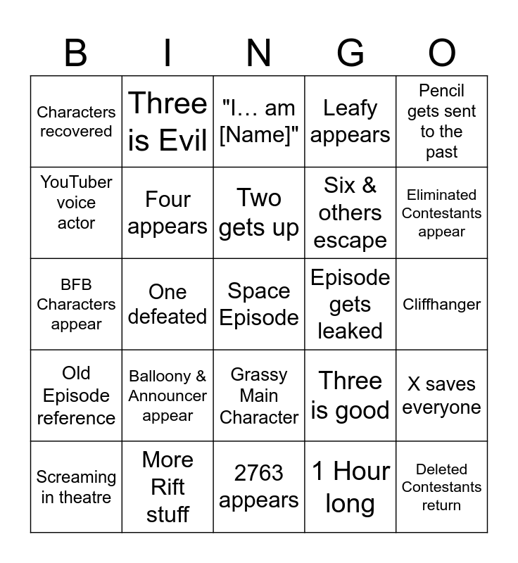 This bingo card has a free space and 24 words: Balloony & Announcer appear, More Rift stuff, Two gets up, Screaming in theatre, Pencil gets sent to the past, Characters recovered, YouTuber voice actor, Three is Evil, Episode gets leaked, Grassy Main Character, Six & others escape, BFB Characters appear, Three is good, X saves everyone, Four appears, 1 Hour long, Cliffhanger, "I… am [Name]", Eliminated Contestants appear, One defeated, Deleted Contestants return, Old Episode reference, Leafy appears and 2763 appears.
