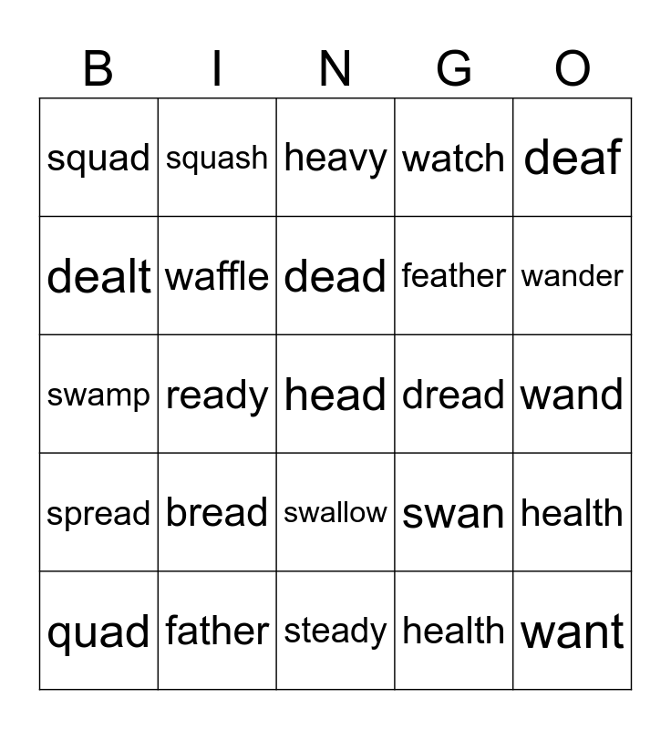 This bingo card has a free space and 24 words: bread, father, dead, quad, deaf, squad, dealt, squash, dread, swallow, feather, swamp, swan, health, waffle, health, wand, heavy, wander, ready, want, spread, watch and steady.