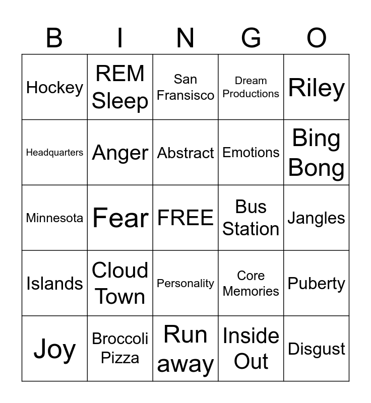 This bingo card has a free space and 29 words: Joy, Sadness, Fear, Wagon Rocket, Hockey, San Fransisco, Anger, Cloud Town, Bus Station, Broccoli Pizza, Jangles, Disgust, Run away, Inside Out, Bing Bong, Memory, Personality, Islands, Riley, Minnesota, Core Memories, Recall Tube, Emotions, Headquarters, Dream Productions, REM Sleep, Puberty, Abstract and Console.