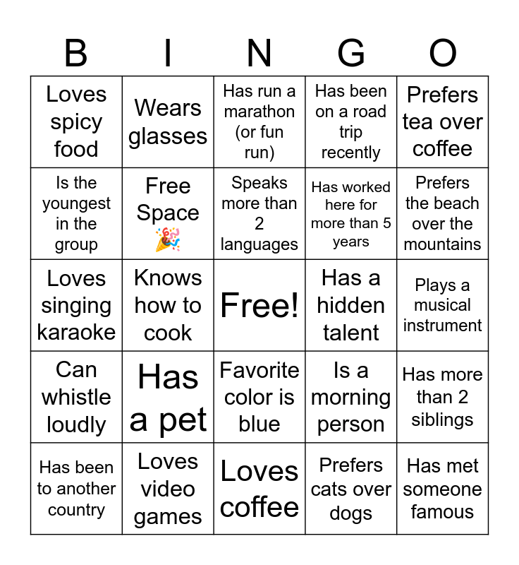 This bingo card has a free space and 25 words: Has a pet, Loves coffee, Speaks more than 2 languages, Has been to another country, Prefers tea over coffee, Loves spicy food, Is the youngest in the group, Wears glasses, Has a hidden talent, Favorite color is blue, Has worked here for more than 5 years, Loves singing karaoke, Is a morning person, Has more than 2 siblings, Free Space 🎉, Loves watching Netflix, Plays a musical instrument, Has run a marathon (or fun run), Prefers the beach over the mountains, Knows how to cook, Has met someone famous, Loves video games, Can whistle loudly, Has been on a road trip recently and Prefers cats over dogs.