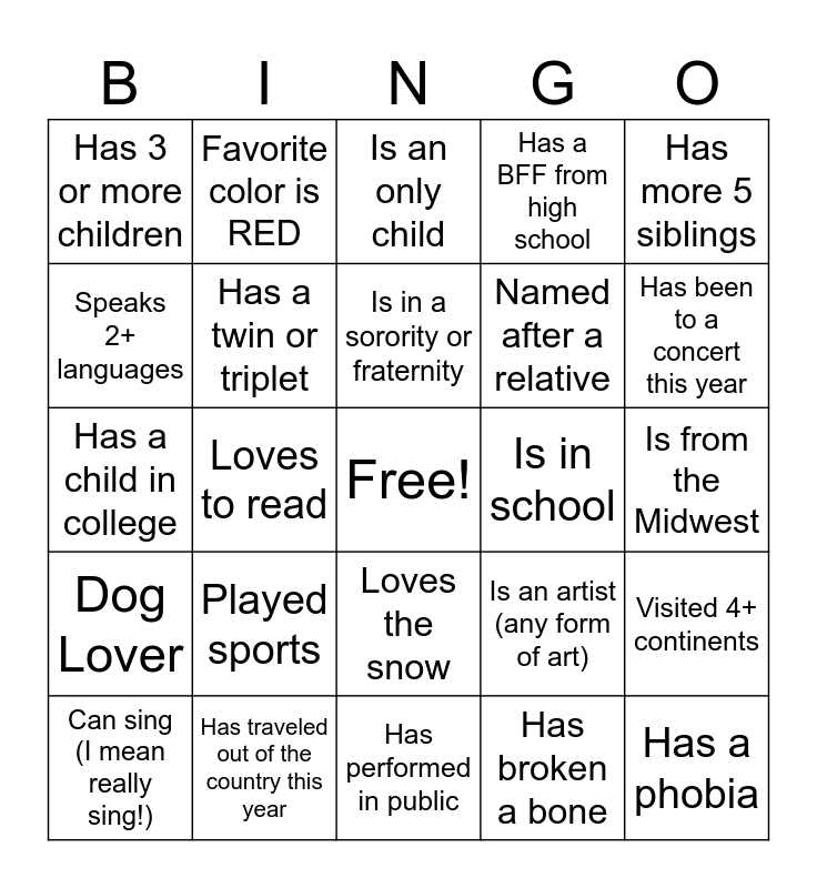 This bingo card has a free space and 33 words: Is from Chicago, First job in an FQHC, Loves to read, Cat Lover, Dog Lover, Has a twin or triplet, Has more 5 siblings, Can sing (I mean really sing!), Favorite color is RED, Was born outside of the US, Is in a sorority or fraternity, Is an only child, Is a vegetarian, Has never flown, Is in school, Has been to a concert this year, Has traveled out of the country this year, Has a child in college, Played sports, Is an artist (any form of art), Loves the snow, Has never flown, Has 3 or more children, Is from the Midwest, Has performed in public, Has a phobia, Has a BFF from high school, Named after a relative, Speaks 2+ languages, Visited 4+ continents, Good cook, Has broken a bone and Birthday is on a holiday.