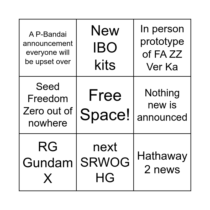 This bingo card has a free space and 8 words: Nothing new is announced, In person prototype of FA ZZ Ver Ka, New IBO kits, RG Gundam X, A P-Bandai announcement everyone will be upset over, Hathaway 2 news, Seed Freedom Zero out of nowhere and next SRWOG HG.