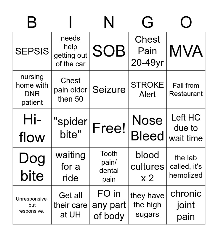 This bingo card has a free space and 46 words: abdominal pain but patient is eating food, chronic joint pain, COPD, FO in any part of body, waiting for a ride, aflutter/afib, needs help getting out of the car, "free" pregnancy test, nursing home with DNR patient, vomiting blood, Chest pain older then 50, Chest Pain 20-49yr, the lab called, it's hemolized, blood cultures x 2, Conscious sedation, knee pain, Seizure, Nose Bleed, Broken bone, MVA, "spider bite", they have the high sugars, SEPSIS, STROKE Alert, Fall at Nursing home, Fall from Restaurant, Unresponsive- but responsive.., Back pain, Tooth pain/ dental pain, Dog bite, Needs MRI, Transfer to HC, Transfer to UH, Transfer to CCF, CCT transfer, Get all their care at UH, Left HC due to wait time, Peds fever- with no meds given, Flu A/B+, RSV+ or Covid+, Eye Complaint, Enema, SOB, Hi-flow, C-Pap/Bi-Pap, Sent by UC and Send by PCP.
