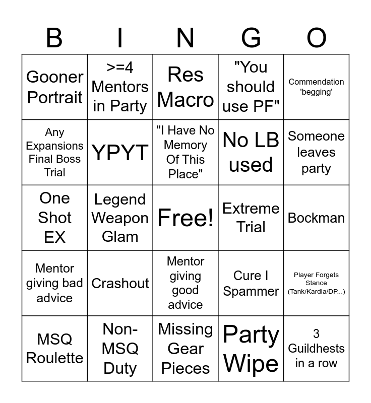 This bingo card has a free space and 31 words: Missing Gear Pieces, Legend Title, Legend Weapon Glam, Full Sprout Party, Gooner Portrait, Res Macro, YPYT, Cure I Spammer, Extreme Trial, Party Wipe, Bockman, 3 Guildhests in a row, Crystal Tower, Late Fill (>= 20 min ellapsed), Someone leaves party, Rare Instance, Player Forgets Stance (Tank/Kardia/DP...), Crashout, Mentor giving bad advice, Mentor giving good advice, Commendation 'begging', Last Man Standing, MSQ Roulette, >=4 Mentors in Party, No LB used, Any Expansions Final Boss Trial, "You should use PF", One Shot EX, Non-MSQ Duty, "I Have No Memory Of This Place" and Burger King Moment.