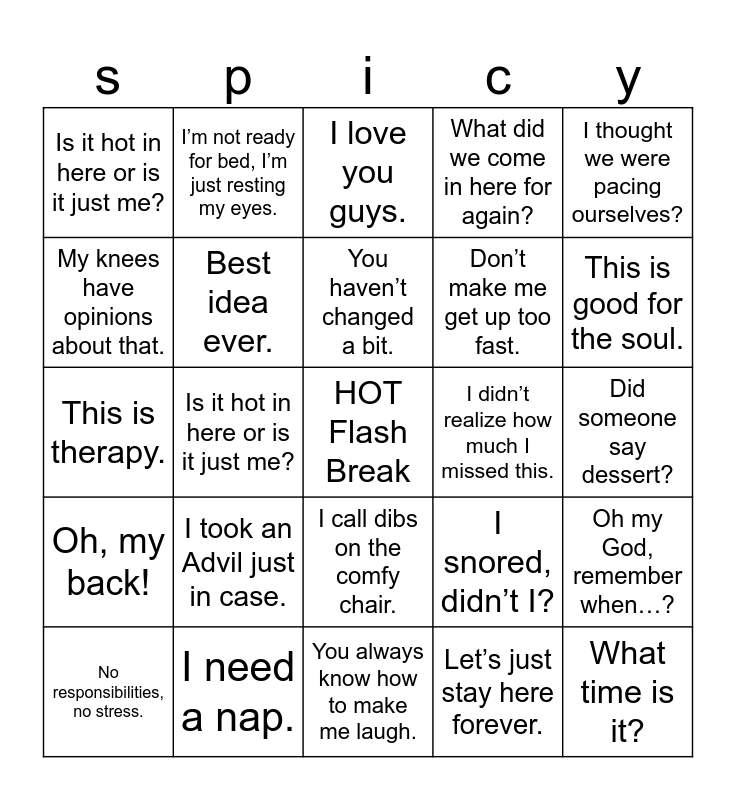 This bingo card has a free space and 64 words: We should do this every year!, Whose idea was this?, You look exactly the same!, Oh my God, remember when…?, Someone take a picture of this., Wait, do I have something in my teeth?, I’m not ready for bed, I’m just resting my eyes., I laughed so hard I almost peed!, You haven’t changed a bit., I brought snaaacks!, I call dibs on the comfy chair., Pass the chips., Did someone say dessert?, I thought we were pacing ourselves?, Where’s my drink?, My knees have opinions about that., Is it hot in here or is it just me?, Is it hot in here or is it just me?, I forgot what I was saying…, Don’t make me get up too fast., I took an Advil just in case., Oh, my back!, What did we come in here for again?, I swear I used to have more energy., Let’s all agree we’re not morning people, Let’s dance!, Play our song!, Turn it up!, That was MY jam in high school., We need a group selfie!, Somebody start the music., I’m not saying I’m old, but my dance moves are vintage., I’m the DJ tonight!, I needed this weekend., This is good for the soul., No responsibilities, no stress., This view is amazing., Let’s just stay here forever., I’m so glad we all came., Best idea ever., This is therapy., I didn’t realize how much I missed this., Can we move here?, Who’s making coffee?, Don’t talk to me until I’ve had caffeine., What time is it?, I need a nap., Did anyone sleep last night?, I snored, didn’t I?, I could get used to this., Do we have any ibuprofen?, We’ve been through so much together., You always know how to make me laugh., We’re not old, we’re seasoned., You haven’t changed a bit., I’m so proud of us., I love you guys., Don’t post that photo!, I should’ve worn the other shoes., These jeans are not forgiving., Where’s my phone?, I swear I just had it., Whose bra is this? and 22.