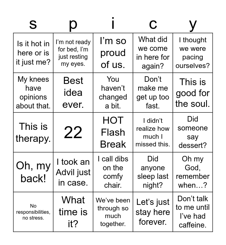 This bingo card has a free space and 63 words: We should do this every year!, Whose idea was this?, You look exactly the same!, Oh my God, remember when…?, Someone take a picture of this., Wait, do I have something in my teeth?, I’m not ready for bed, I’m just resting my eyes., I laughed so hard I almost peed!, You haven’t changed a bit., I brought snaaacks!, I call dibs on the comfy chair., Pass the chips., Did someone say dessert?, I thought we were pacing ourselves?, Where’s my drink?, My knees have opinions about that., 22, Is it hot in here or is it just me?, I forgot what I was saying…, Don’t make me get up too fast., I took an Advil just in case., Oh, my back!, What did we come in here for again?, I swear I used to have more energy., Let’s all agree we’re not morning people, Let’s dance!, Play our song!, Turn it up!, That was MY jam in high school., We need a group selfie!, Somebody start the music., I’m not saying I’m old, but my dance moves are vintage., I’m the DJ tonight!, I needed this weekend., This is good for the soul., No responsibilities, no stress., This view is amazing., Let’s just stay here forever., I’m so glad we all came., Best idea ever., This is therapy., I didn’t realize how much I missed this., Can we move here?, Who’s making coffee?, Don’t talk to me until I’ve had caffeine., What time is it?, I need a nap., Did anyone sleep last night?, I snored, didn’t I?, I could get used to this., Do we have any ibuprofen?, We’ve been through so much together., You always know how to make me laugh., We’re not old, we’re seasoned., You haven’t changed a bit., I’m so proud of us., I love you guys., Don’t post that photo!, I should’ve worn the other shoes., These jeans are not forgiving., Where’s my phone?, I swear I just had it. and Whose bra is this?.