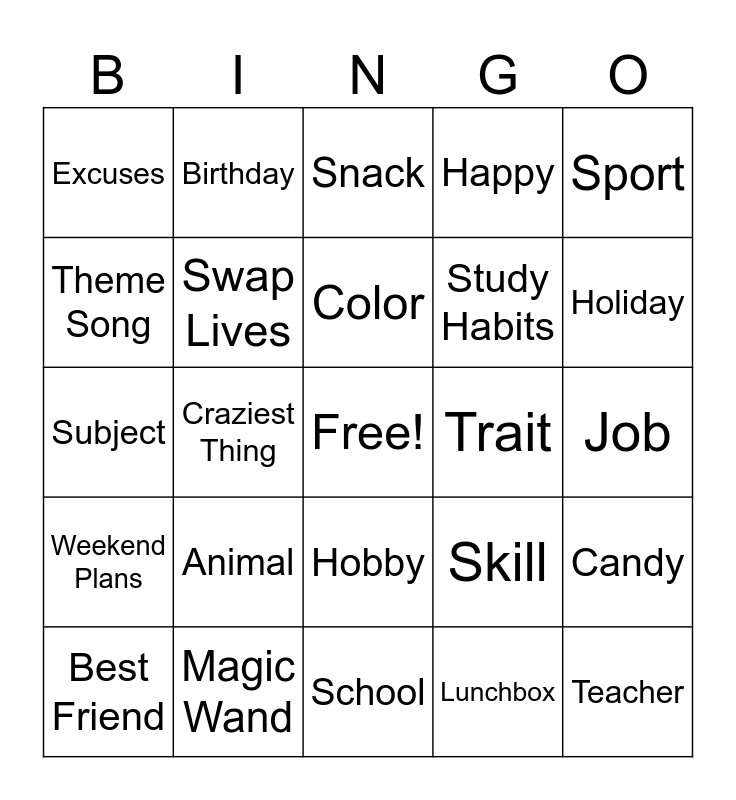 This bingo card has a free space and 24 words: Animal, Magic Wand, Color, Best Friend, Sport, Excuses, Theme Song, Birthday, Trait, Hobby, Study Habits, Subject, Skill, Candy, Swap Lives, Lunchbox, Job, Snack, Holiday, Craziest Thing, Teacher, Weekend Plans, Happy and School.