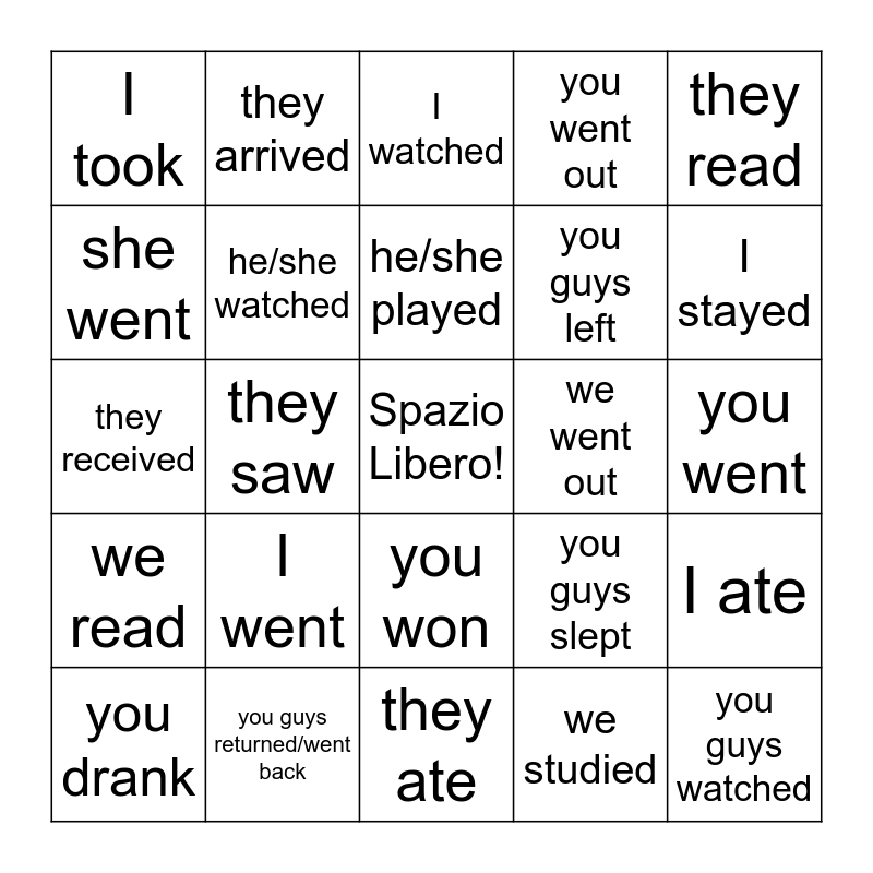 This bingo card has a free space and 24 words: I went, you guys returned/went back, he/she played, you drank, they read, I took, she went, they arrived, we went out, you won, you guys left, they received, you guys slept, I ate, he/she watched, we studied, you went, I watched, I stayed, they saw, you guys watched, we read, you went out and they ate.