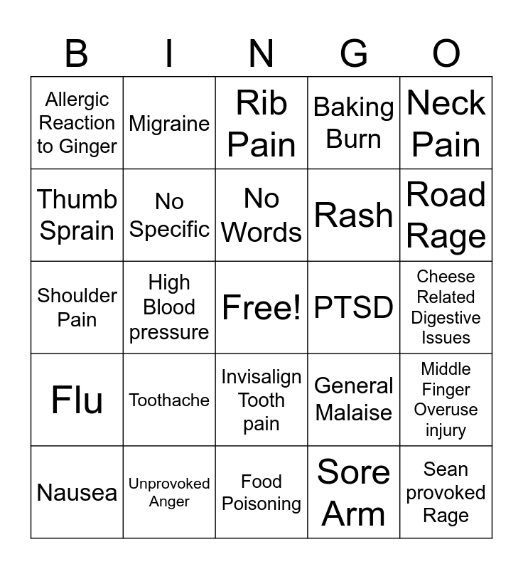 This bingo card has a free space and 24 words: Nausea, Toothache, No Words, Sore Arm, Neck Pain, Allergic Reaction to Ginger, Migraine, Rib Pain, PTSD, Cheese Related Digestive Issues, Shoulder Pain, No Specific, General Malaise, Middle Finger Overuse injury, Thumb Sprain, Unprovoked Anger, Food Poisoning, Baking Burn, Road Rage, Flu, High Blood pressure, Invisalign Tooth pain, Rash and Sean provoked Rage.