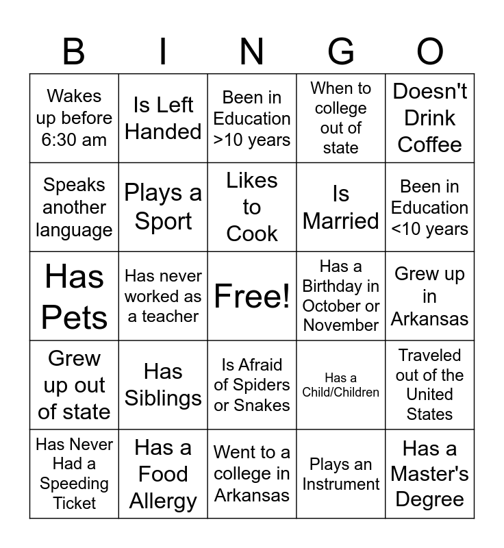 This bingo card has a free space and 24 words: Has Siblings, Has a Food Allergy, Likes to Cook, Has Never Had a Speeding Ticket, Doesn't Drink Coffee, Wakes up before 6:30 am, Speaks another language, Is Left Handed, Has a Birthday in October or November, Is Afraid of Spiders or Snakes, Is Married, Has Pets, Has a Child/Children, Traveled out of the United States, Plays a Sport, Plays an Instrument, Grew up in Arkansas, Been in Education >10 years, Been in Education <10 years, Has never worked as a teacher, Has a Master's Degree, Grew up out of state, When to college out of state and Went to a college in Arkansas.
