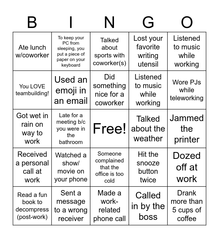This bingo card has a free space and 27 words: Hit the snooze button twice, Went to the gym/worked out (outside of work), Listened to music while working, Made a work-related phone call, You LOVE teambuilding!, Talked about sports with coworker(s), To keep your PC from sleeping, you put a piece of paper on your keyboard, Received a personal call at work, Talked about the weather, Dozed off at work, Got wet in rain on way to work, Lost your favorite writing utensil, Read a fun book to decompress (post-work), Sent a message to a wrong receiver, Wore PJs while teleworking, Cursed someone while on mute, Used an emoji in an email, Did something nice for a coworker, Watched a show/ movie on your phone, Ate lunch w/coworker, Jammed the printer, Called in by the boss, Late for a meeting b/c you were in the bathroom, Drank more than 5 cups of coffee, Someone complained that the office is too cold, Listened to music while working and Watched a show/ movie on your phone.