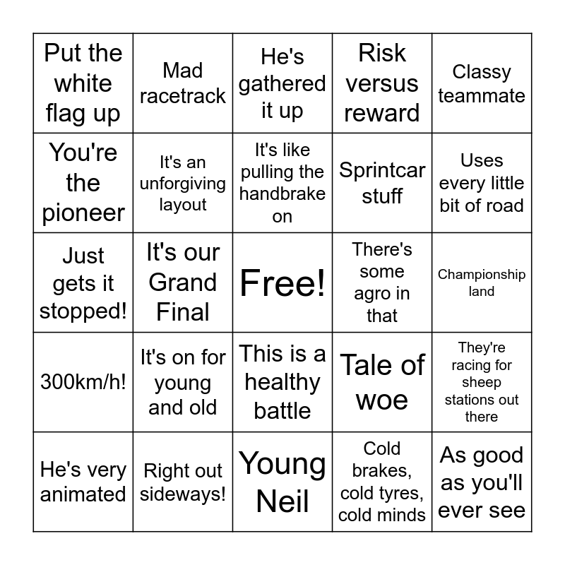 This bingo card has a free space and 34 words: Safety cars breed safety cars, Cold brakes, cold tyres, cold minds, These guys play for keeps, Wet weather specialist, 300km/h!, It's an unforgiving layout, Classy teammate, He's very animated, Mad racetrack, That's a bit ugly, It's like pulling the handbrake on, He's gathered it up, He's got great car control!, He's in the fence!, There's some agro in that, Uses every little bit of road, Right out sideways!, Just gets it stopped!, It's on for young and old, Tale of woe, This is a healthy battle, Well done Larko, Put the white flag up, Championship land, Young Neil, As good as you'll ever see, Risk versus reward, Out of control, Sprintcar stuff, You're the pioneer, Fastest straight in Australian Motorsport, It's our Grand Final, They're racing for sheep stations out there and Opening stanza.