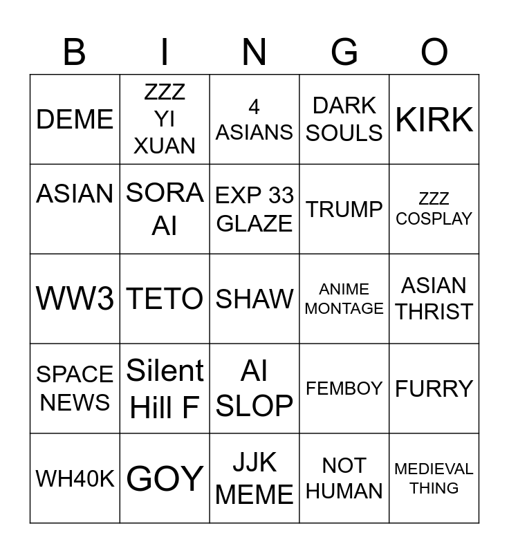 This bingo card has a free space and 24 words: Silent Hill F, GOY, EXP 33 GLAZE, WH40K, KIRK, DEME, ASIAN, ZZZ YI XUAN, ANIME MONTAGE, AI SLOP, TRUMP, WW3, FEMBOY, FURRY, SORA AI, NOT HUMAN, ASIAN THRIST, 4 ASIANS, ZZZ COSPLAY, TETO, MEDIEVAL THING, SPACE NEWS, DARK SOULS and JJK MEME.
