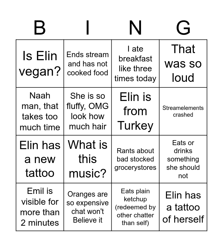 This bingo card has 16 words: Oranges are so expensive chat won't Believe it, Eats or drinks something she should not, I ate breakfast like three times today, Is Elin vegan?, Elin has a new tattoo, Ends stream and has not cooked food, Rants about bad stocked grocerystores, Eats plain ketchup (redeemed by other chatter than self), Naah man, that takes too much time, She is so fluffy, OMG look how much hair, Emil is visible for more than 2 minutes, That was so loud, What is this music?, Streamelements crashed, Elin is from Turkey and Elin has a tattoo of herself.