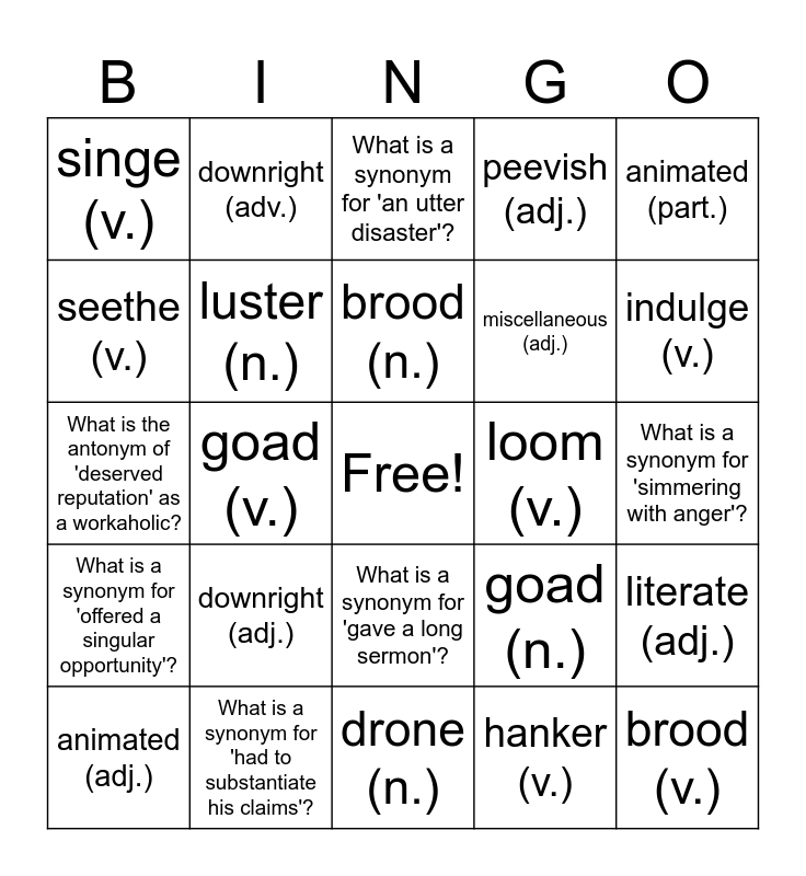 This bingo card has a free space and 48 words: singe (n.), brood (v.), loom (n.), drone (n.), downright (adj.), verify (v.), downright (adv.), upright (adj.), seethe (v.), constituent (n.), luster (n.), peevish (adj.), literate (adj.), goad (n.), oration (n.), drone (v.), brood (n.), loom (v.), unique (adj.), animated (part.), goad (v.), hanker (v.), singe (v.), miscellaneous (adj.), upright (adv.), indulge (v.), animated (adj.), culminate (v.), What is a synonym for 'gave a long sermon'?, What is a synonym for 'offered a singular opportunity'?, What is a synonym for 'lost some of its brilliance with each performance'?, What is a synonym for 'told not to agonize over the details'?, What is a synonym for 'the key ingredient in the process'?, What is a synonym for 'the crabby, teething baby'?, What is a synonym for 'had to substantiate his claims'?, What is a synonym for 'tree branches scorched by the fire'?, What is a synonym for 'propped in a vertical position'?, What is a synonym for 'simmering with anger'?, What is a synonym for 'despite the danger that appears ahead'?, What is a synonym for 'coddle their grandchildren'?, What is a synonym for 'attempted to incite others into action'?, What is a synonym for 'crave Paris in the springtime'?, What is a synonym for 'an utter disaster'?, What is the antonym of 'unschooled' in the context of physics and calculus?, What is the antonym of 'deserved reputation' as a workaholic?, What is the antonym of 'summarized' in the context of demands?, What is the antonym of 'receding' when referring to danger? and What is the antonym of 'commence' in the context of a campaign?.