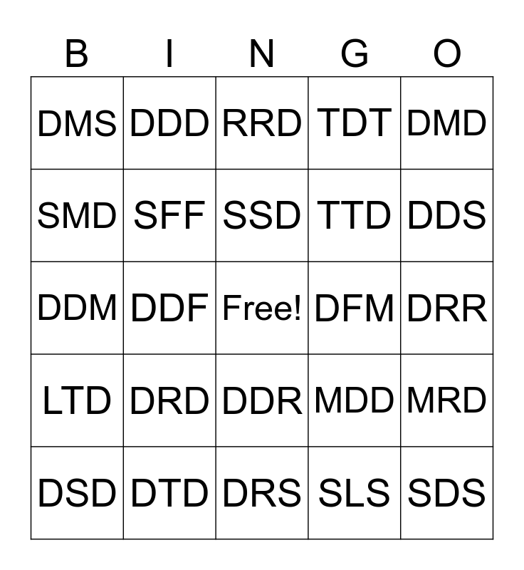 This bingo card has a free space and 24 words: DRD, DTD, SSD, DSD, DMD, DMS, SMD, DDD, DFM, DDR, TTD, DDM, MDD, MRD, SFF, SLS, DRR, RRD, DDS, DDF, SDS, LTD, TDT and DRS.