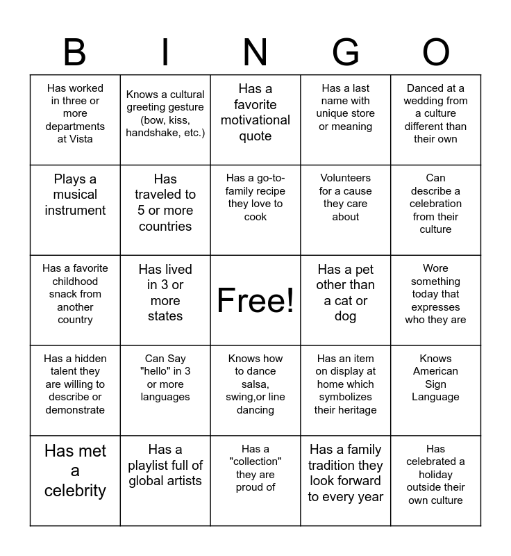This bingo card has a free space and 24 words: Can Say "hello" in 3 or more languages, Has a playlist full of global artists, Has a go-to-family recipe they love to cook, Has met a celebrity, Danced at a wedding from a culture different than their own, Has worked in three or more departments at Vista, Plays a musical instrument, Knows a cultural greeting gesture (bow, kiss, handshake, etc.), Has a pet other than a cat or dog, Knows how to dance salsa, swing,or line dancing, Volunteers for a cause they care about, Has a favorite childhood snack from another country, Has an item on display at home which symbolizes their heritage, Knows American Sign Language, Has traveled to 5 or more countries, Has a family tradition they look forward to every year, Wore something today that expresses who they are, Has a favorite motivational quote, Can describe a celebration from their culture, Has lived in 3 or more states, Has celebrated a holiday outside their own culture, Has a hidden talent they are willing to describe or demonstrate, Has a last name with unique store or meaning and Has a "collection" they are proud of.