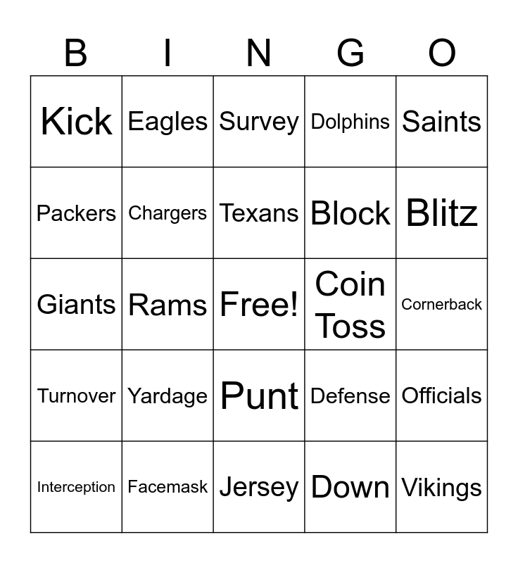 This bingo card has a free space and 75 words: Engagement, Colleague, Survey, Cardinals, Ravens, Falcons, Bills, Panthers, Bengals, Bears, Browns, Lions, Texans, Packers, Colts, Rams, Jaguars, Vikings, Chiefs, Saints, Raiders, Giants, Chargers, Eagles, Dolphins, 49ers, Patriots, Seahawks, Jets, Buccaneers, Steelers, Commanders, Titans, Defense, Blitz, Block, Quarterback, Center, Cornerback, Down, Drive, Flag, First Down, Fullback, Fumble, Hike, Interception, Kick, Kickoff, Linebacker, NFL, Punt, Rush, Sack, Scrimmage, Snap, Spike, Starter, Touchdown, Superbowl, Yardage, Safety, Lombardi Trophy, Half Time, Gameday, Coin Toss, Hail Mary, Offense, Huddle, Officials, Turnover, Facemask, Helmet, Jersey and End Zone.