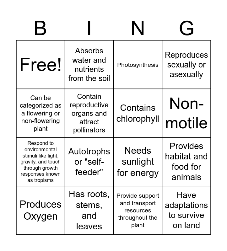 This bingo card has 16 words: Produces Oxygen, Has roots, stems, and leaves, Photosynthesis, Reproduces sexually or asexually, Can be categorized as a flowering or non-flowering plant, Absorbs water and nutrients from the soil, Needs sunlight for energy, Provides habitat and food for animals, Free!, Contain reproductive organs and attract pollinators, Provide support and transport resources throughout the plant, Non-motile, Respond to environmental stimuli like light, gravity, and touch through growth responses known as tropisms, Autotrophs or "self-feeder", Contains chlorophyll and Have adaptations to survive on land.