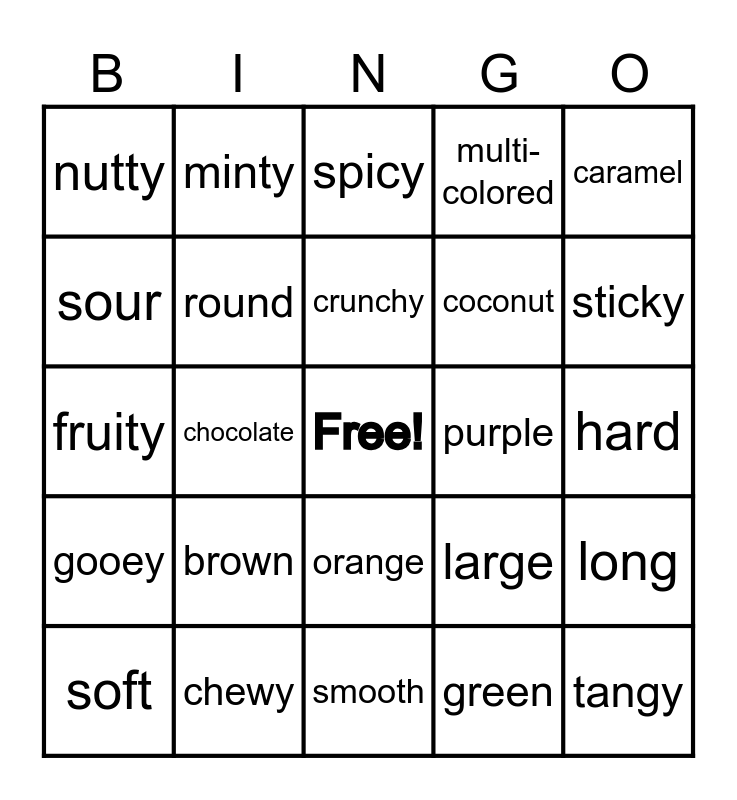 This bingo card has a free space and 24 words: brown, chewy, crunchy, soft, caramel, nutty, sour, minty, purple, orange, coconut, fruity, large, long, round, green, hard, spicy, sticky, chocolate, tangy, gooey, multi-colored and smooth.