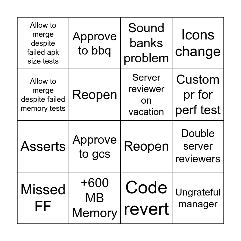 This bingo card has 16 words: +600 MB Memory, Double server reviewers, Sound banks problem, Allow to merge despite failed apk size tests, Asserts, Approve to bbq, Reopen, Code revert, Allow to merge despite failed memory tests, Reopen, Missed FF, Icons change, Approve to gcs, Custom pr for perf test, Server reviewer on vacation and Ungrateful manager.