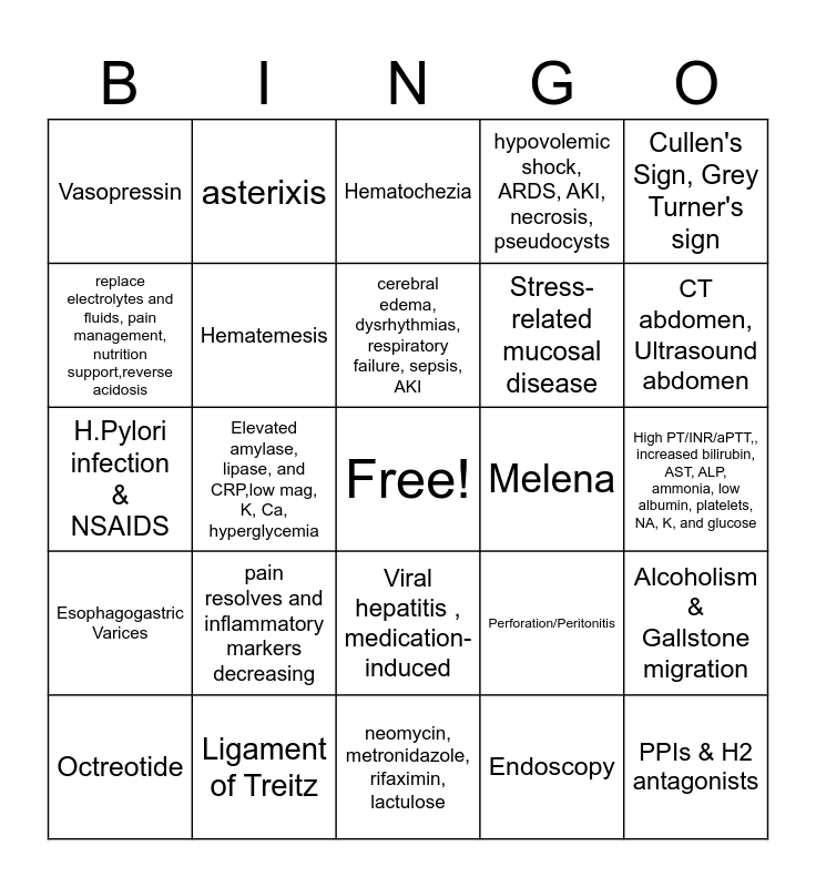 This bingo card has a free space and 24 words: pain resolves and inflammatory markers decreasing, Ligament of Treitz, cerebral edema, dysrhythmias, respiratory failure, sepsis, AKI, Octreotide, Cullen's Sign, Grey Turner's sign, Vasopressin, replace electrolytes and fluids, pain management, nutrition support,reverse acidosis, asterixis, Melena, Viral hepatitis , medication-induced, Stress-related mucosal disease, H.Pylori infection & NSAIDS, Perforation/Peritonitis, Alcoholism & Gallstone migration, Hematemesis, Endoscopy, High PT/INR/aPTT,, increased bilirubin, AST, ALP, ammonia, low albumin, platelets, NA, K, and glucose, Hematochezia, CT abdomen, Ultrasound abdomen, Elevated amylase, lipase, and CRP,low mag, K, Ca, hyperglycemia, PPIs & H2 antagonists, Esophagogastric Varices, hypovolemic shock, ARDS, AKI, necrosis, pseudocysts and neomycin, metronidazole, rifaximin, lactulose.