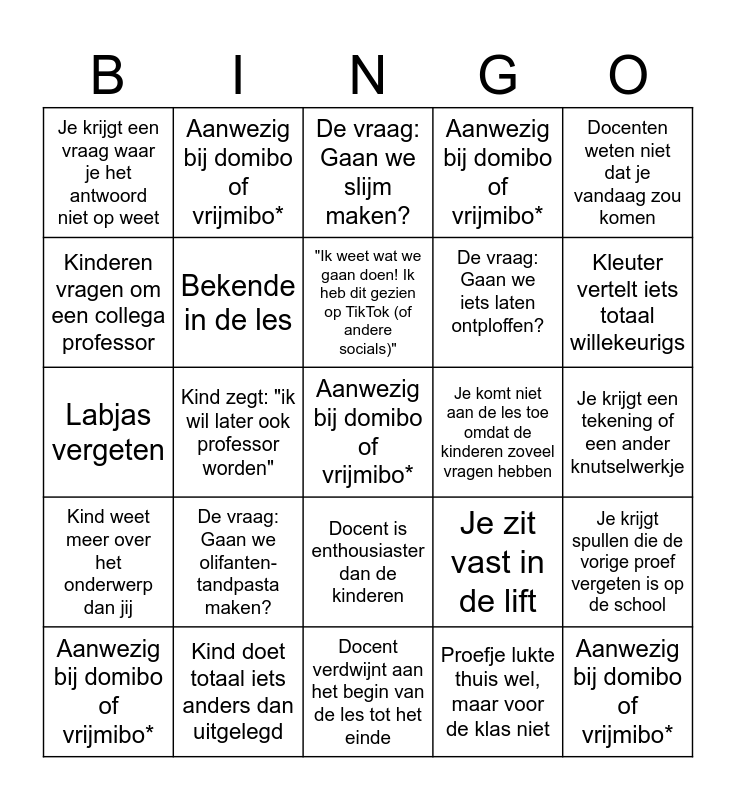 This bingo card has a free space and 24 words: Aanwezig bij domibo of vrijmibo*, De vraag: Gaan we olifanten- tandpasta maken?, "Ik weet wat we gaan doen! Ik heb dit gezien op TikTok (of andere socials)", Proefje lukte thuis wel, maar voor de klas niet, Docenten weten niet dat je vandaag zou komen, Je krijgt een vraag waar je het antwoord niet op weet, Aanwezig bij domibo of vrijmibo*, De vraag: Gaan we slijm maken?, Je komt niet aan de les toe omdat de kinderen zoveel vragen hebben, Je krijgt een tekening of een ander knutselwerkje, Labjas vergeten, Bekende in de les, Je zit vast in de lift, Je krijgt spullen die de vorige proef vergeten is op de school, Kinderen vragen om een collega professor, Kind doet totaal iets anders dan uitgelegd, Docent verdwijnt aan het begin van de les tot het einde, Aanwezig bij domibo of vrijmibo*, Kleuter vertelt iets totaal willekeurigs, Kind weet meer over het onderwerp dan jij, Kind zegt: "ik wil later ook professor worden", Docent is enthousiaster dan de kinderen, De vraag: Gaan we iets laten ontploffen? and Aanwezig bij domibo of vrijmibo*.