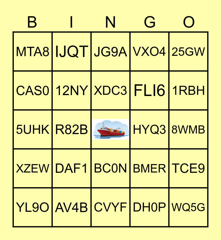 This bingo card has a free space and 24 words: DAF1, AV4B, XDC3, YL9O, 25GW, MTA8, CAS0, IJQT, HYQ3, BC0N, FLI6, 5UHK, BMER, TCE9, 12NY, DH0P, 8WMB, JG9A, 1RBH, R82B, WQ5G, XZEW, VXO4 and CVYF.