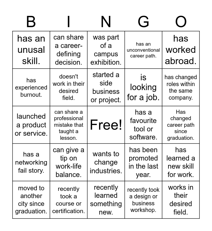 This bingo card has a free space and 24 words: moved to another city since graduation., can give a tip on work-life balance., started a side business or project., recently took a design or business workshop., has worked abroad., has an unusal skill., can share a career-defining decision., was part of a campus exhibition., has a favourite tool or software., Has changed career path since graduation., launched a product or service., doesn't work in their desired field., has been promoted in the last year., has learned a new skill for work., has experienced burnout., recently took a course or certification., recently learned something new., has an unconventional career path., has changed roles within the same company., has a networking fail story., can share a professional mistake that taught a lesson., wants to change industries., is looking for a job. and works in their desired field..