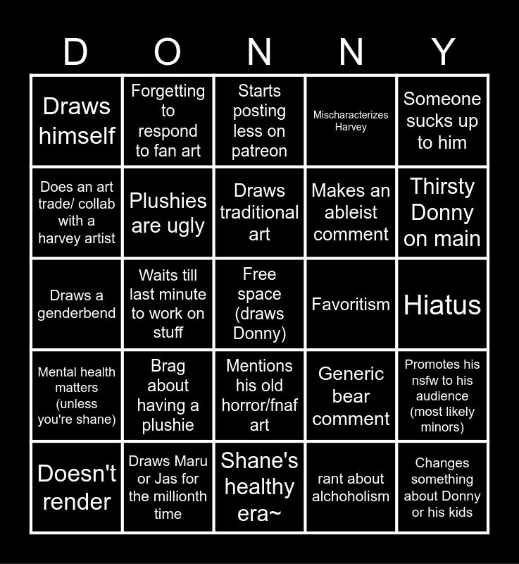 This bingo card has a free space and 24 words: Brag about having a plushie, Draws Maru or Jas for the millionth time, Draws traditional art, Doesn't render, Someone sucks up to him, Draws himself, Does an art trade/ collab with a harvey artist, Forgetting to respond to fan art, Favoritism, Mentions his old horror/fnaf art, Makes an ableist comment, Draws a genderbend, Generic bear comment, Promotes his nsfw to his audience (most likely minors), Plushies are ugly, rant about alchoholism, Hiatus, Starts posting less on patreon, Thirsty Donny on main, Waits till last minute to work on stuff, Changes something about Donny or his kids, Mental health matters (unless you're shane), Mischaracterizes Harvey and Shane's healthy era~.