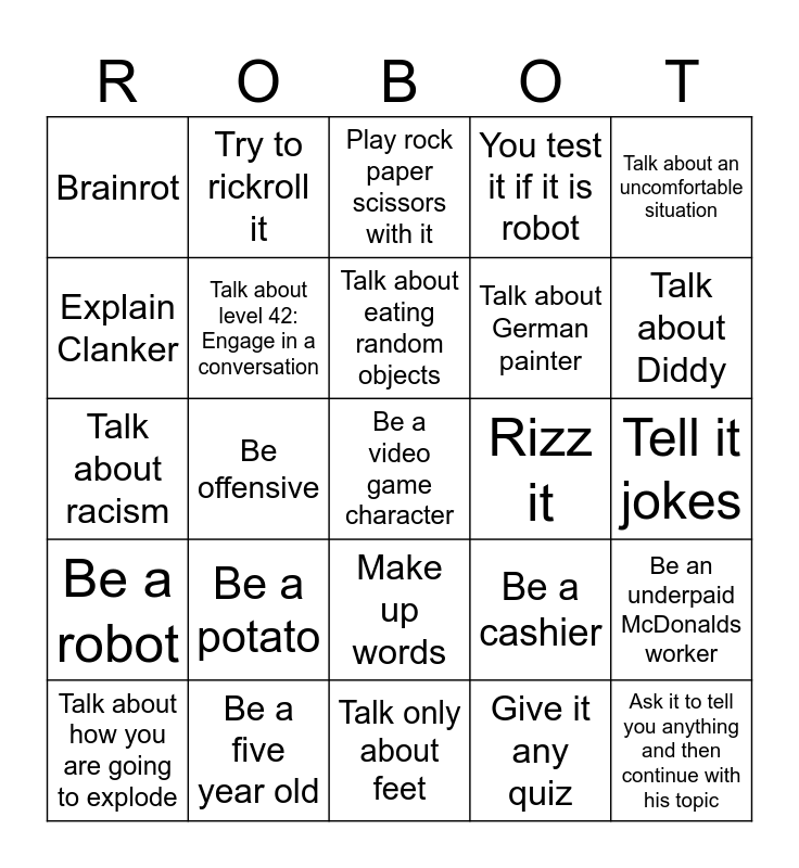 This bingo card has 25 words: Be a potato, Talk only about feet, Talk about eating random objects, Talk about how you are going to explode, Talk about an uncomfortable situation, Brainrot, Explain Clanker, Try to rickroll it, Rizz it, Make up words, Talk about German painter, Talk about racism, Be a cashier, Be an underpaid McDonalds worker, Talk about level 42: Engage in a conversation, Ask it to tell you anything and then continue with his topic, Tell it jokes, Play rock paper scissors with it, Talk about Diddy, Be offensive, Be a video game character, Be a five year old, Be a robot, You test it if it is robot and Give it any quiz.