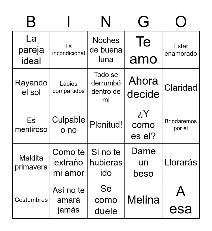 This bingo card has a free space and 54 words: Tu dama de hierro, Maldita primavera, Simplemente amigos, Como te va mi amor, Si no te hubieras ido, Un buen perdedor, Te amo, Mariposa traicionera, Rayando el sol, Ya te olvidé, La pareja ideal, Mi eterno amor secreto, Así no te amará jamás, Costumbres, La ladrona, Se como duele, A esa, Ahora decide, Así fue, Brindaremos por el, Dame un beso, Como te va mi amor, ¿Y como es el?, Estar enamorado, El gato que está triste y azul, La incondicional, Fría como el viento, Déjame vivir, Fue un placer conocerte, Melina, Fresa salvaje, Mary es mi amor, Mi joven profesor de amor, La loba, Noches de buena luna, Diavolo, Es mentiroso, Llorarás, La camisa negra, Labios compartidos, Tiempo de vals, Mas que un amigo, Pídeme la luna, Tu cárcel, Como te extraño mi amor, Olvidame y pega la vuelta, La gata bajo la lluvia, Frente afrente, Todo se derrumbó dentro de mi, Culpable o no, Claridad, Señora de las cuatro décadas, Mujeres and Sólo se vive una vez.