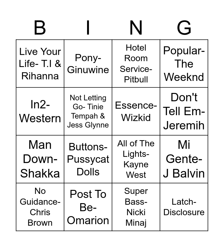 This bingo card has 52 words: Replay-Iyaz, No Guidance- Chris Brown, Woman- Doja Cat, Feels- Pharrell Williams, Knock You Down- Keri Hilson, Pass Out- Tinie Tempah, Pony- Ginuwine, Ridin Solo- Jason Derulo, Not Letting Go- Tinie Tempah & Jess Glynne, Espresso- Sabrina Carpenter, Essence- Wizkid, Dance Wiv Me- Dizzee Rascal, Smack That- Akon & Eminem, Worth It- Fifth Harmony, Work- Rihanna & Drake, Ignition- R.Kelly, Don't Tell Em- Jeremih, Post To Be- Omarion, Ayo- Chris Brown, In2- Western, Mi Gente- J Balvin, 24k Magic- Bruno Mars, Live Your Life- T.I & Rihanna, Man Down- Shakka, Location- Dave, Freak Of The Week- Krept & Konan, The Sweet Escape- Gwen Steffani, Earthquake- Labrinth, Buttons- Pussycat Dolls, Fire Burning- Sean Kingston, Side to Side- Ariana Grande, Popular- The Weeknd, Pretty Girl Rock- Keri Hilson, First Class- Jack Harlow, Paint The Town Red- Doja Cat, Hotel Room Service- Pitbull, Promiscuous- Nelly Furtado, Last Last- Burna Boy, Don't Mind- Kent Jones, Players- Coi Leray, Bang Bang- Jessie J, Super Bass- Nicki Minaj, Latch- Disclosure, Bedrock- Young Money, 21 Questions- 50 Cent, Empire State of Mind- Jay Z, No Lie- Sean Paul, All of The Lights- Kayne West, Buzzin- Mann, Young, Dumb and Broke- Khalid, Ayo Technology- 50 Cent and Freaky Friday- Chris Brown.